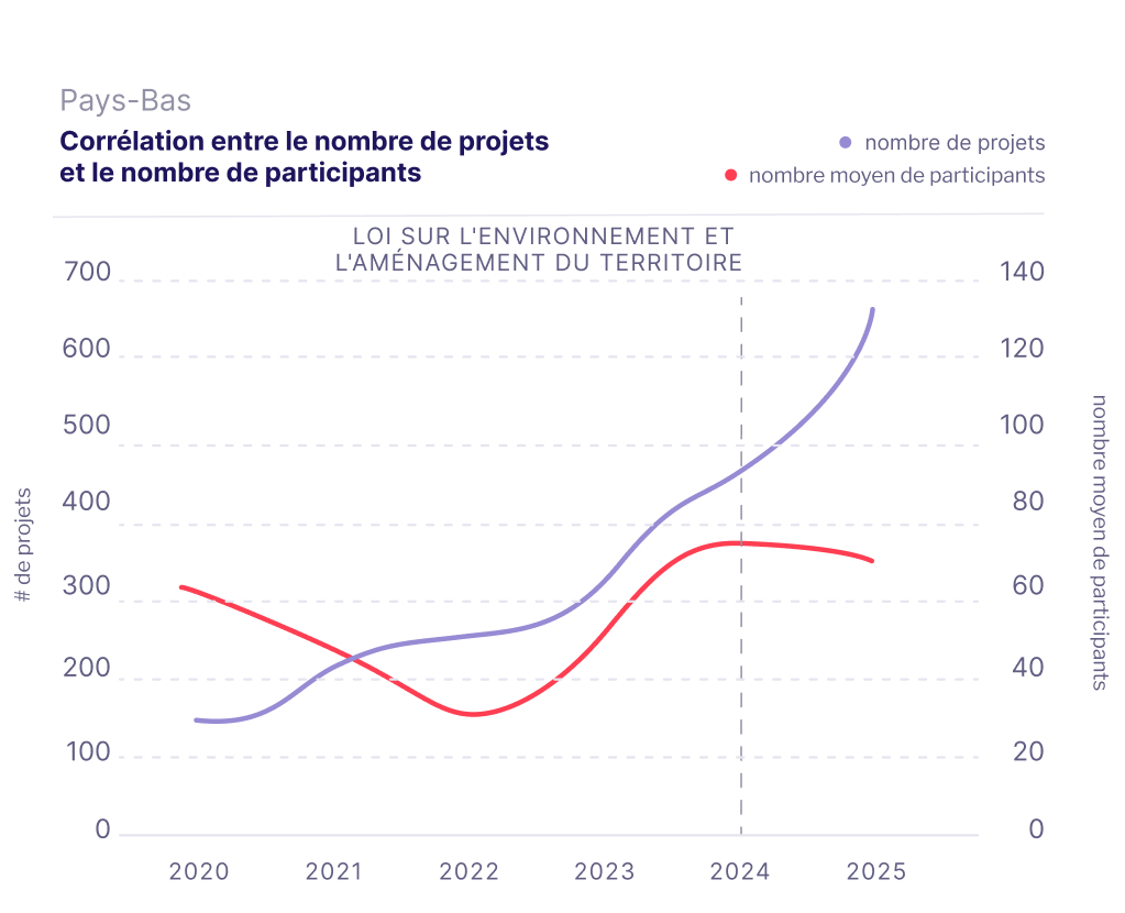 - Aux Pays-Bas, la multiplication des projets participatifs ne s’accompagne pas automatiquement d’une augmentation de la participation globale ; le nombre de participants par projet tend à rester stable.